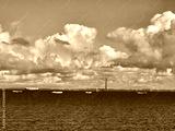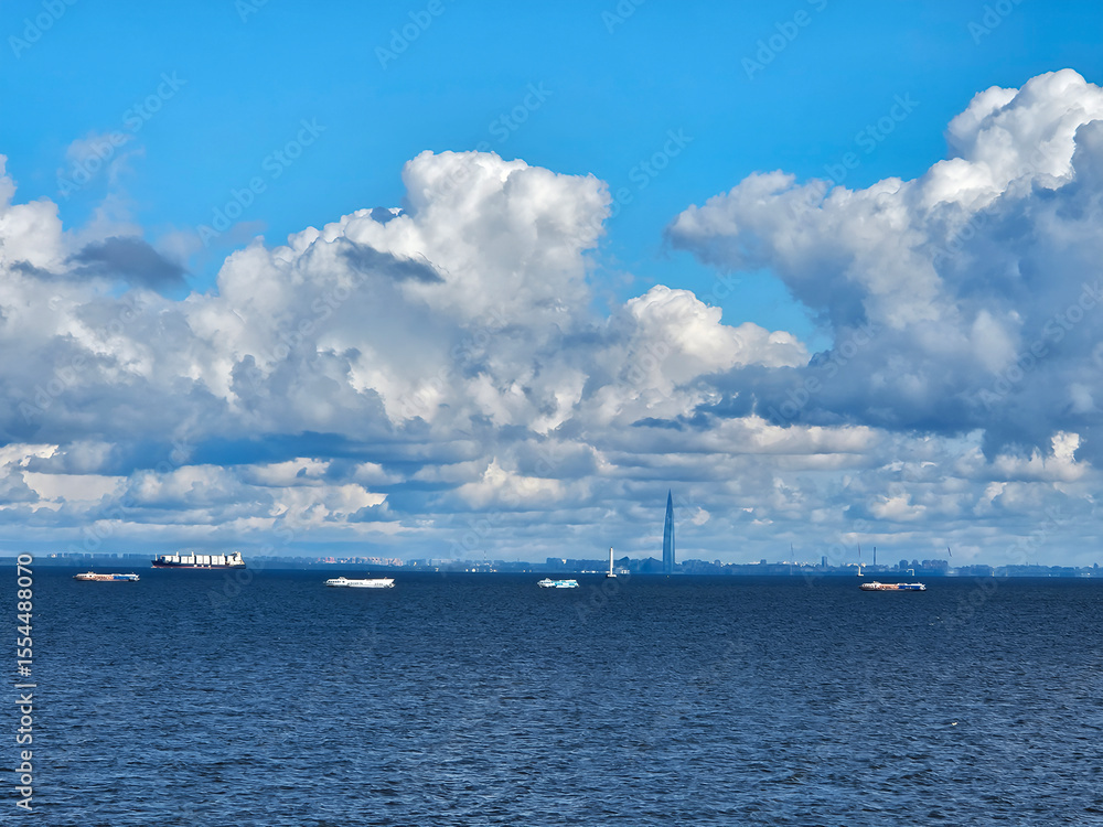 Large body of water with a few boats floating on it. The sky is cloudy and the sun is shining near Peterhof in Saint-Petersburg