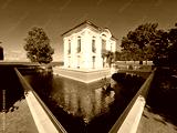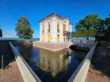 Building Hermitage Pavilion with a pool in front of it. The pool is surrounded by a brick wall. There are trees in the background in Peterhof in Saint-Petersburg