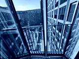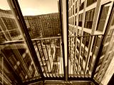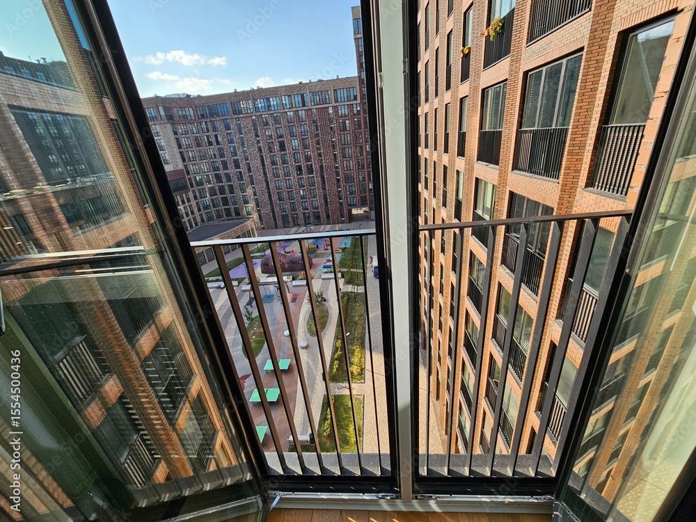 Balcony with a view of a city. The balcony is on the second floor of a building .