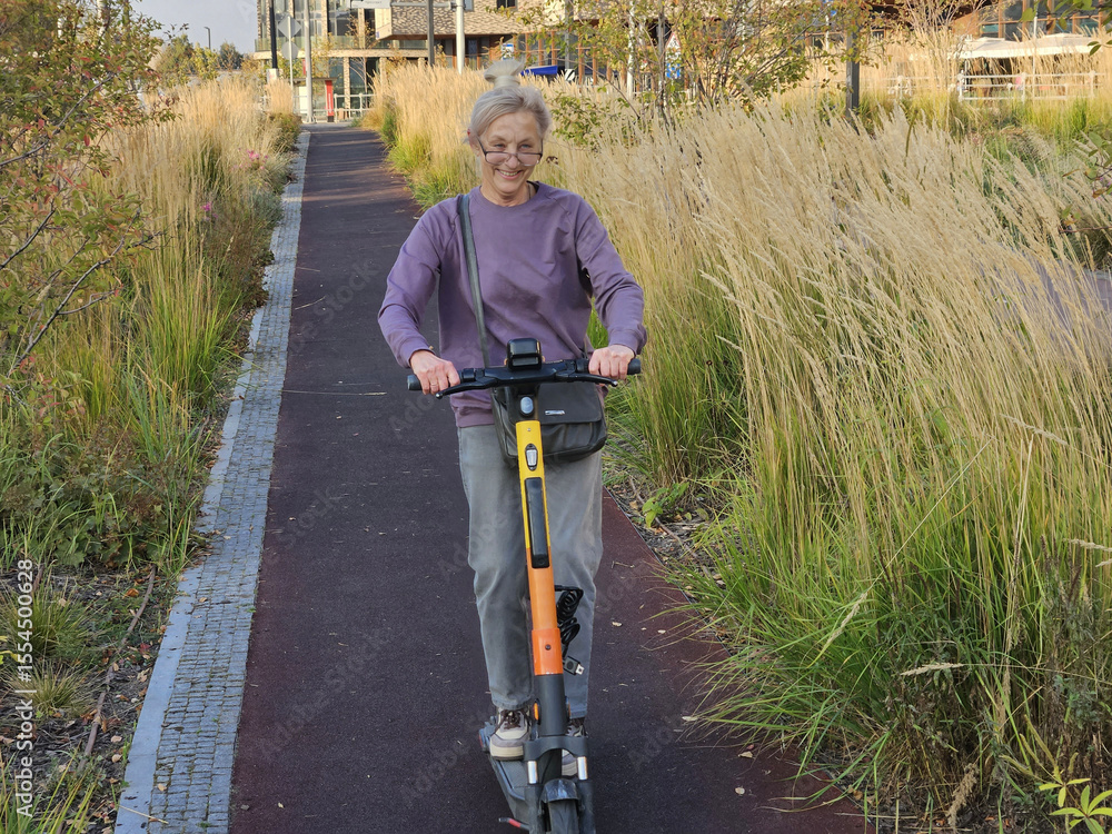 Woman senior is riding a scooter on a path. She is wearing a purple shirt and gray pants