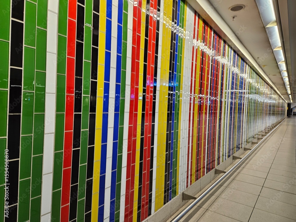 Colorful wall with tiles in a row. The tiles are in different colors. The wall is long in airport in South Africa