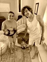 Man and a woman are standing in front of a child in a pink dress inflatable house. The man is wearing a yellow shirt with the letters esek on it. mother holding flowers