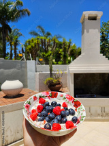 Person is holding a bowl of fruit with yogurt. The bowl contains blueberries and raspberries. The bowl is white and has a floral pattern. fireplace for barbecue in the courtyard of a private house
