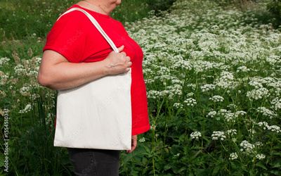 Mature senior woman, female hand holding white eco bag canvas fabric for mock up blank template on meadow with flowers background. Ecology, reusable concept. Eco friendly tote shopper
