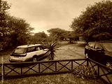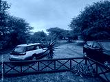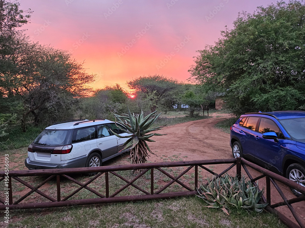 Blue car is parked in front of a wooden fence, with a white car parked behind it. The scene takes place in a rural area, with a sunset in village safari house in South Africa