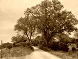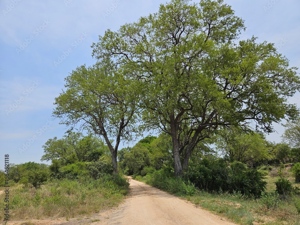 Dirt road with two trees on either side. The road is empty. The sky is blue during safari in park in South Africa