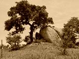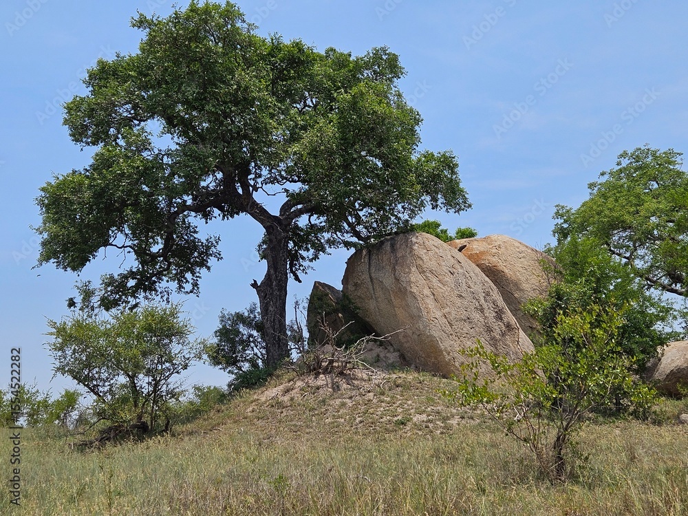 Large tree is growing in front of a large rock during safari in park in South Africa