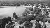 Lush green community Rheudasil Park in Flower Mound, Texas with curved boardwalk, walking trails, playground, upscale suburban two-story houses with resort-style swimming pool, grassy lawn, aerial