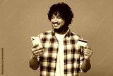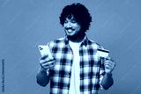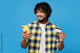 Young Indian man he wear yellow checkered shirt casual clothes using mobile cell phone hold credit bank card doing online shopping order delivery booking tour isolated on plain blue cyan background.
