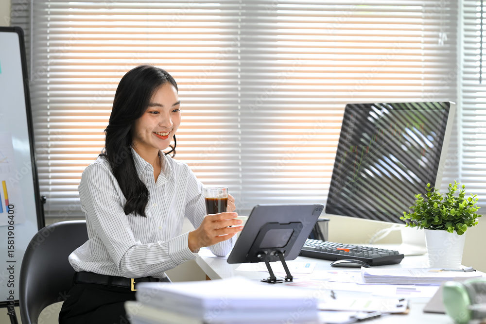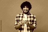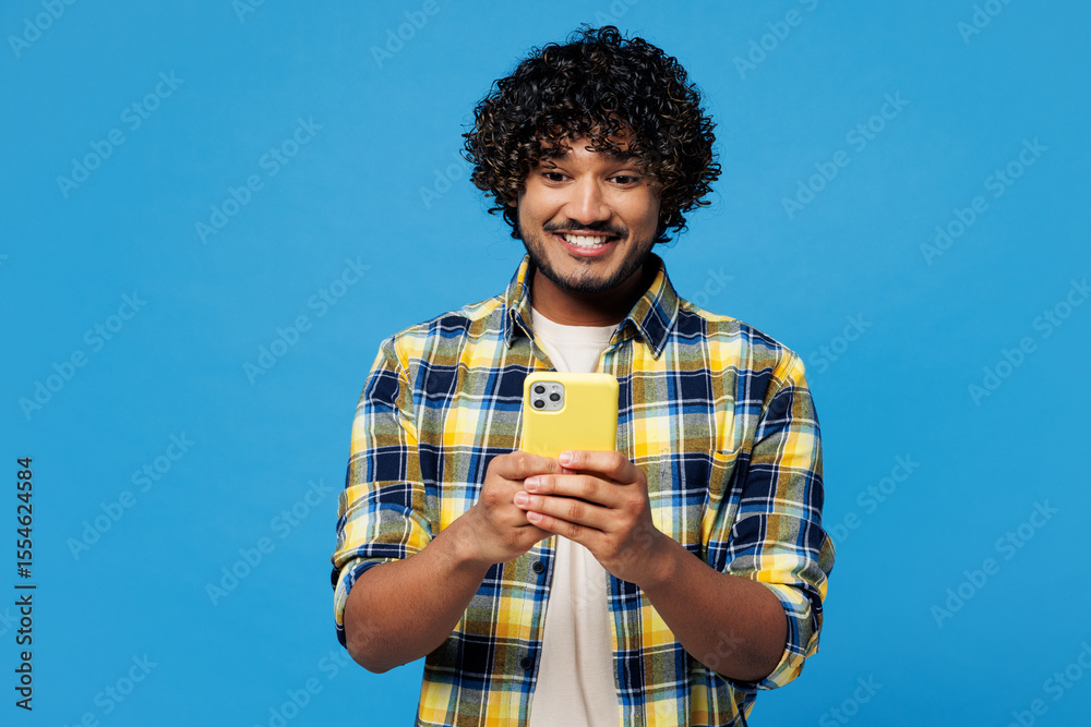 Young happy smiling cheerful Indian man he wearing yellow checkered shirt casual clothes hold in hand use mobile cell phone isolated on plain blue cyan background studio portrait. Lifestyle concept.