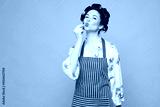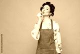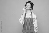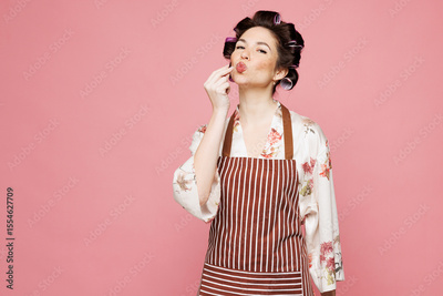 Young satisfied happy housewife housekeeper chef cook baker woman wear brown apron making okay taste delight sign isolated on pastel light pink color background studio portrait. Cooking food concept.