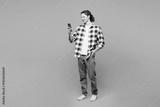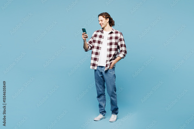 Full body young man wear purple checkered shirt casual clothes hold in hand use mobile cell phone chatting online isolated on plain pastel light blue cyan background studio portrait Lifestyle concept