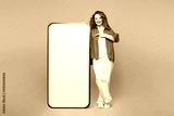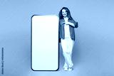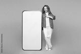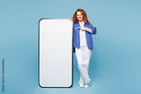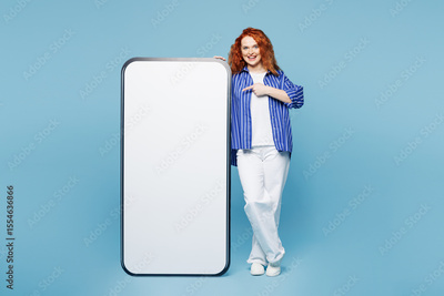 Full body young ginger woman she wear shirt t-shirt casual clothes point finger on big huge blank screen mobile cell phone smartphone with workspace area isolated on plain light blue cyan background.