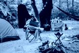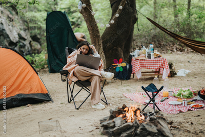 A woman sits in a camping chair using a laptop while surrounded by a vibrant campsite. The site includes tents, a picnic table with food, and a campfire, providing a peaceful yet active atmosphere.