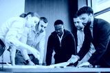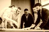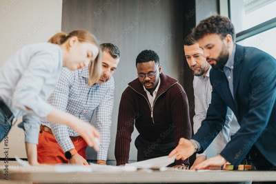 A group of professionals collaborating on a project in a modern work environment, demonstrating teamwork, planning, and coordination to achieve their goals and generate innovative solutions.