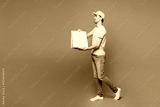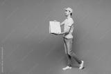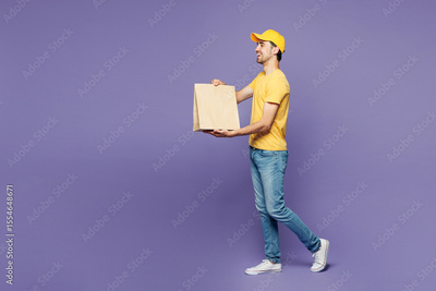 Full body young delivery guy employee man he wear yellow cap t-shirt uniform workwear work as dealer courier old brown clear blank craft paper takeaway bag isolated on plain pastel purple background.