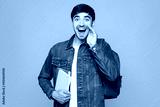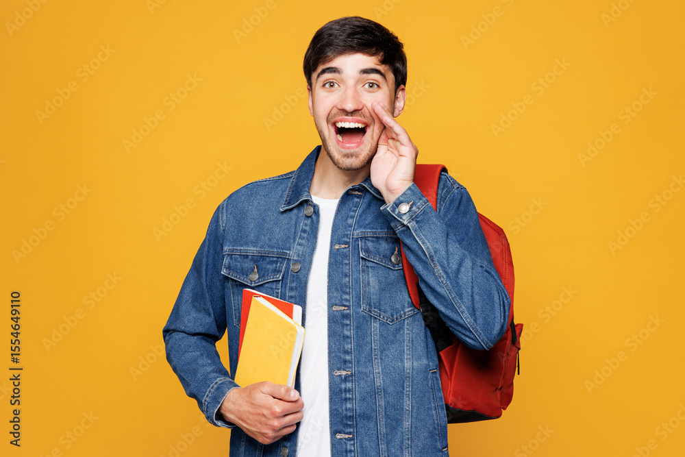 Young boy student wear casual clothes backpack bag hold books scream sharing hot news about sales discount hands near mouth isolated on plain yellow background. High school university college concept.