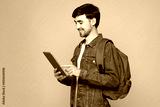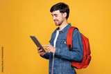 Side view smiling happy young boy IT student he wears denim casual clothes backpack bag hold use digital tablet pc computer isolated on plain yellow background. High school university college concept.