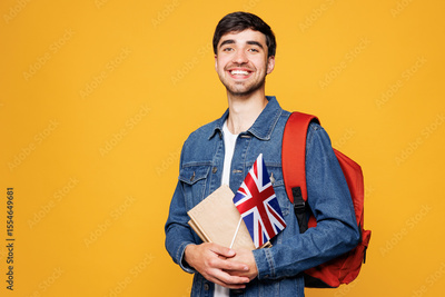 Young smiling clever English boy student he wearing denim casual clothes backpack bag hold books British flag look camera isolated on plain yellow background. High school university college concept.