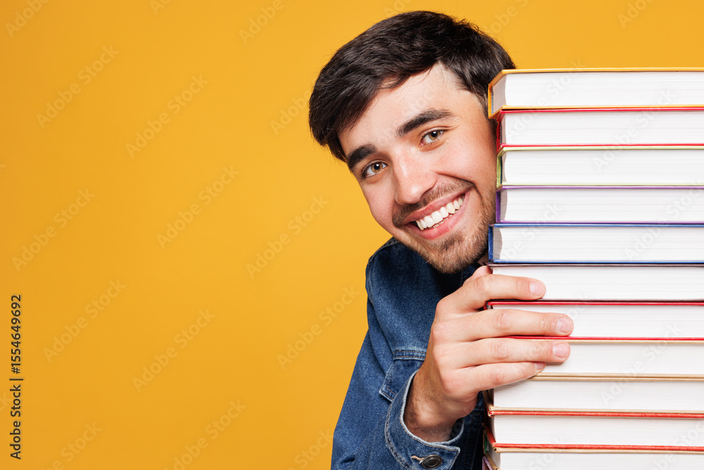 Close up young happy clever smart boy student wears denim casual clothes backpack bag read hold stack of books look camera isolated on plain yellow background. High school university college concept.