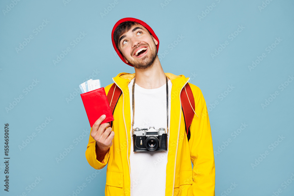 Traveler man wear hat yellow casual clothes hold passport ticket look overhead isolated on plain blue background. Tourist travel abroad in free spare time rest getaway Air flight trip journey concept