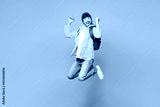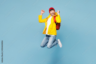 Traveler man wear hat yellow casual clothes jump high do winner gesture isolated on plain pastel blue background. Tourist travel abroad in free spare time rest getaway Air flight trip journey concept