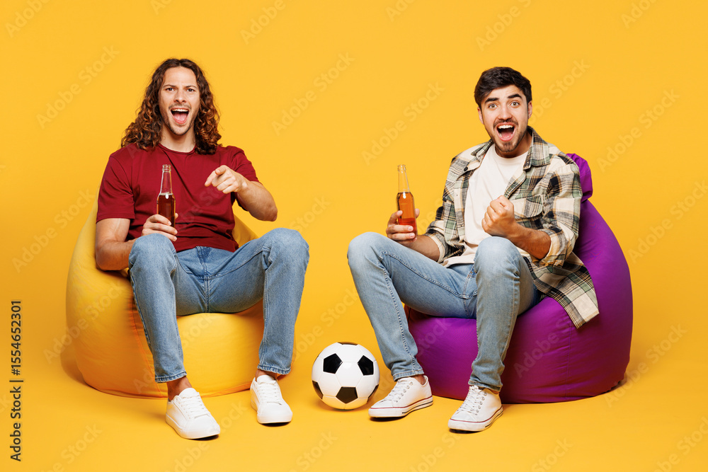 Young excited two friends men sport fans wear casual clothes cheer up support football team hold soccer ball watch tv live stream drink beer hug sit in bag chair isolated on yellow background studio.