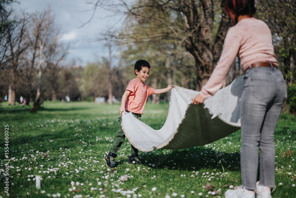 A joyful moment between a mother and her child, enjoying time outdoors laying a picnic blanket on a grassy field surrounded by blooming flowers.