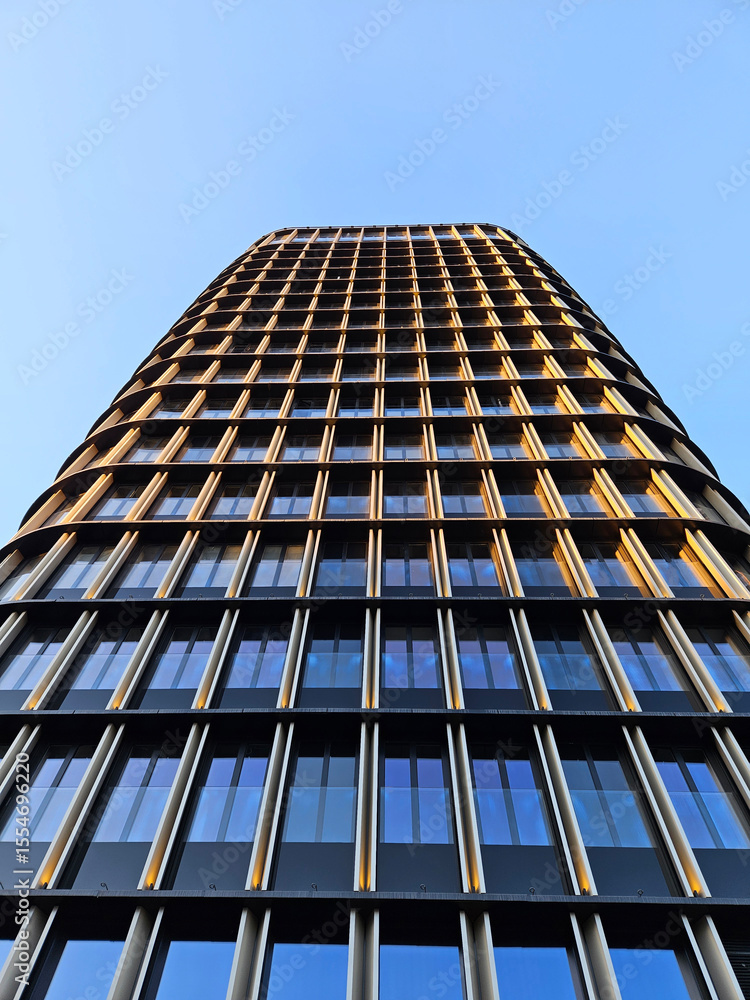 A tall building with many windows and a blue sky in the background. The building is very tall and has a lot of windows