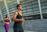 Happy sporty couple promotes healthy lifestyle. Young strong female and male athletes engaged in sports running against background of morning city, functional workout outdoors. Copy space
