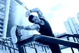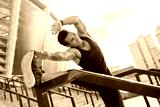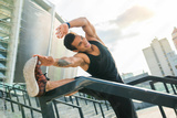 Having a good stretch. Handsome young African man in sports clothing stretching while warming up outdoors. Person exercising outdoors in urban setting city, engaging in a lateral stretch routine