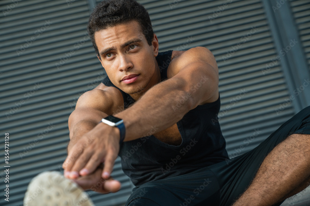 Fitness muscles stretching in city street, young man daily jogging and morning workout training. Physical warmup activity, healthy wellness coaching, sports practice and running for cardio exercise.