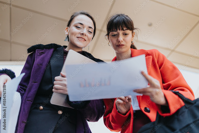 Two professional women analyze charts together during an outdoor business meeting.