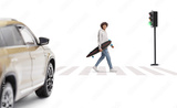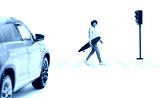 Guy carrying a longboard and walking at zebra crossing