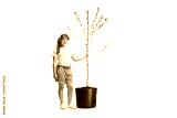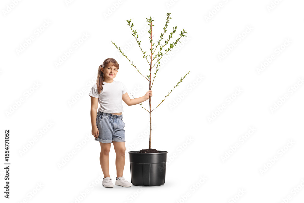 Girl holding the trunk of a young tree