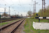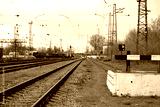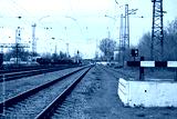 Railway track, metal lines of the railway with gray gears, green grass, large trees against the blue sky.