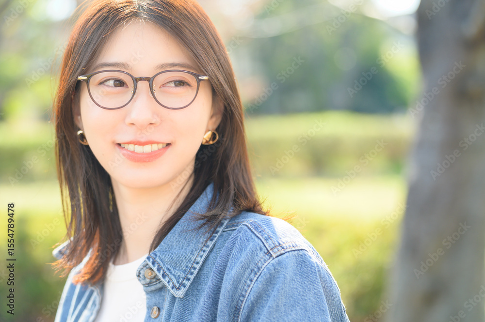 春の陽光の中で眼鏡をかけた女性が横顔で微笑む自然な雰囲気のポートレート