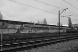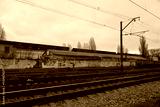 Railway track, metal lines of the railway with gray gears, green grass, large trees against the blue sky.