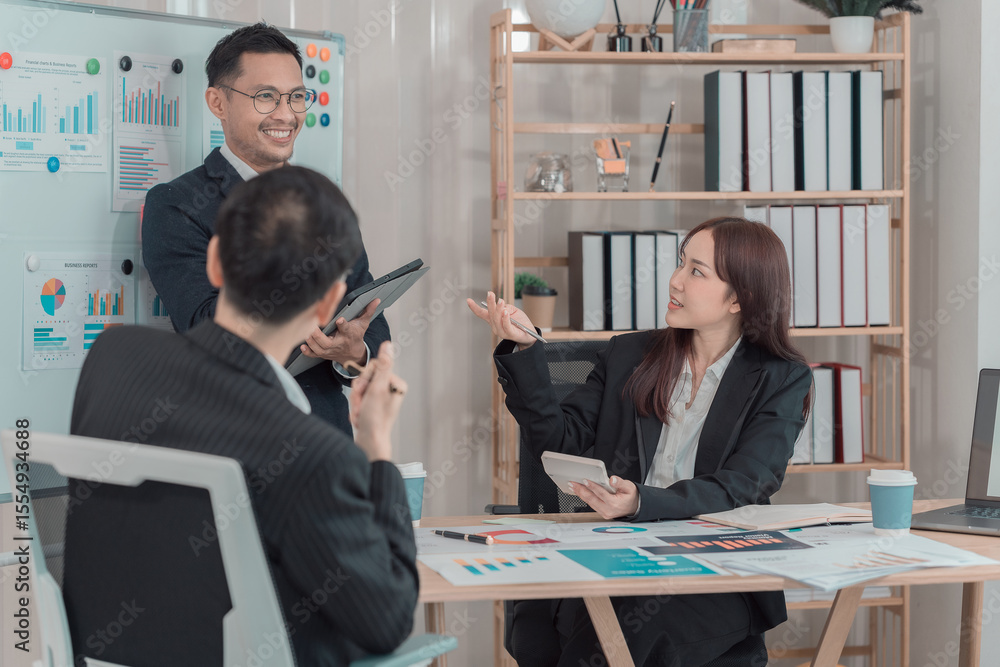 Group of creative young Asian business people expressing joyful excitement with success, teamwork, celebration of success.