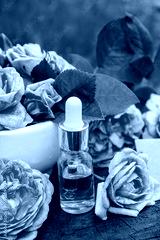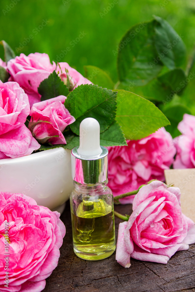 Rose essential oil in a bottle.essential oils.