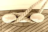 Bollard (cleat) with mooring line on superyacht. Mooring gear on yacht. Superyacht equipment. Top view.