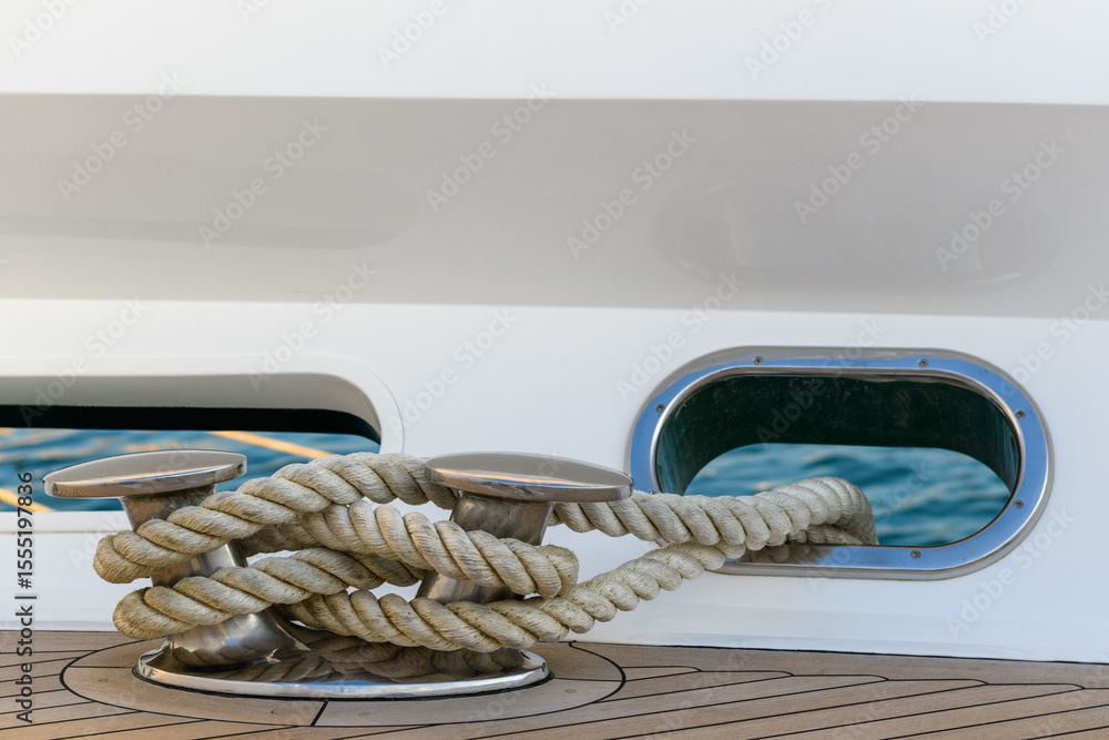 Bollard (cleat) with mooring line on superyacht. Mooring gear on yacht. Superyacht equipment. Side view.