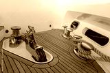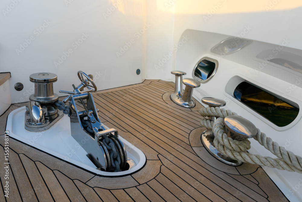 Anchor winch and cleat on superyacht. Anchoring and mooring gear on the bow of yacht. Superyacht equipment.