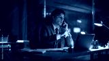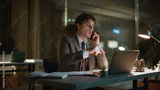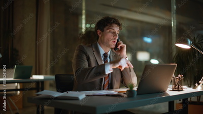 Office worker calling late evening working overtime at laptop workplace closeup