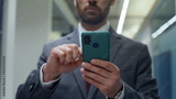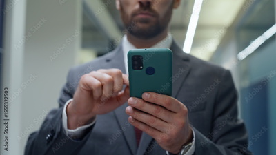 Ceo finger swiping mobile phone walking hall closeup. Businessman going corridor