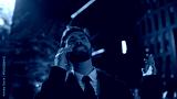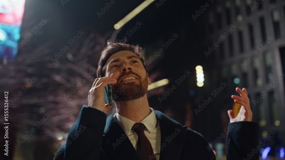 Overjoyed manager calling night business district closeup. Happy man talking