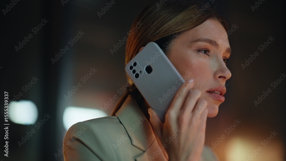 Portrait evening businesswoman talking cellphone at dark cabinet. Woman calling