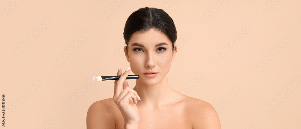 Beautiful young woman with makeup brush on beige background