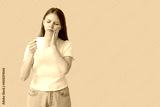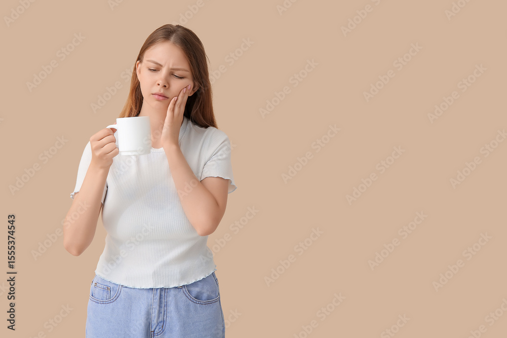 Young woman with sensitive teeth and cup of hot coffee on beige background