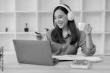 Focused Smiling girl student wearing headphones taking notes while listening to an online class on her laptop distant education